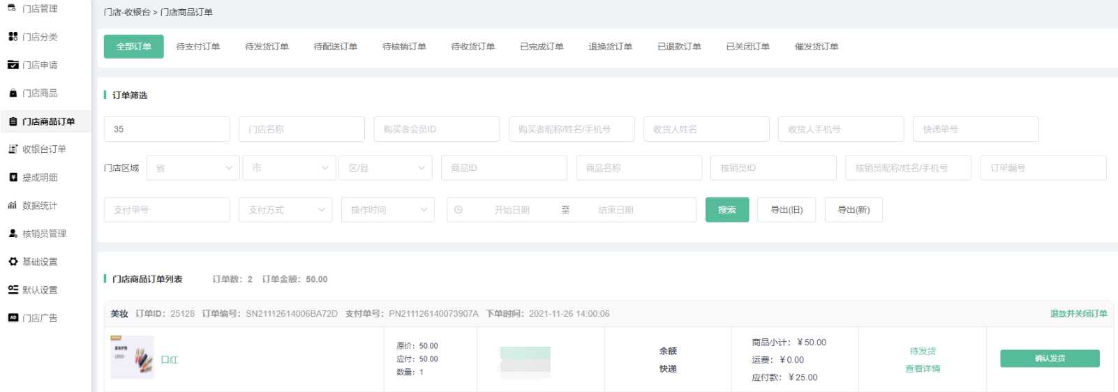 申请通过/后台添加的门店,在门店信息显示,可搜索查看门店的id、名称、所在省市详细地址、门店店长、门店分类、入驻时间、累计实收金额、未结算金额、收银台二维码、门店小程序码等