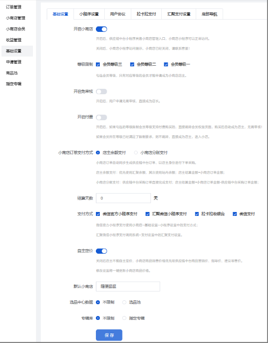 - 自主定价关闭后店主不能自主定价,小商店商品销售价格优先取供应链中台商品营销价、指导价、建议零售价。