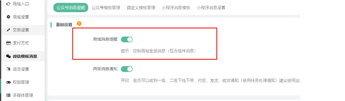 注意:使用公众号消息模板,系统--微信模板消息--公众号消息提醒,商城消息提醒按钮需要开启,这个是控制商城全部消息的(包括插件),未开启商城相关消息通知都不会触发~